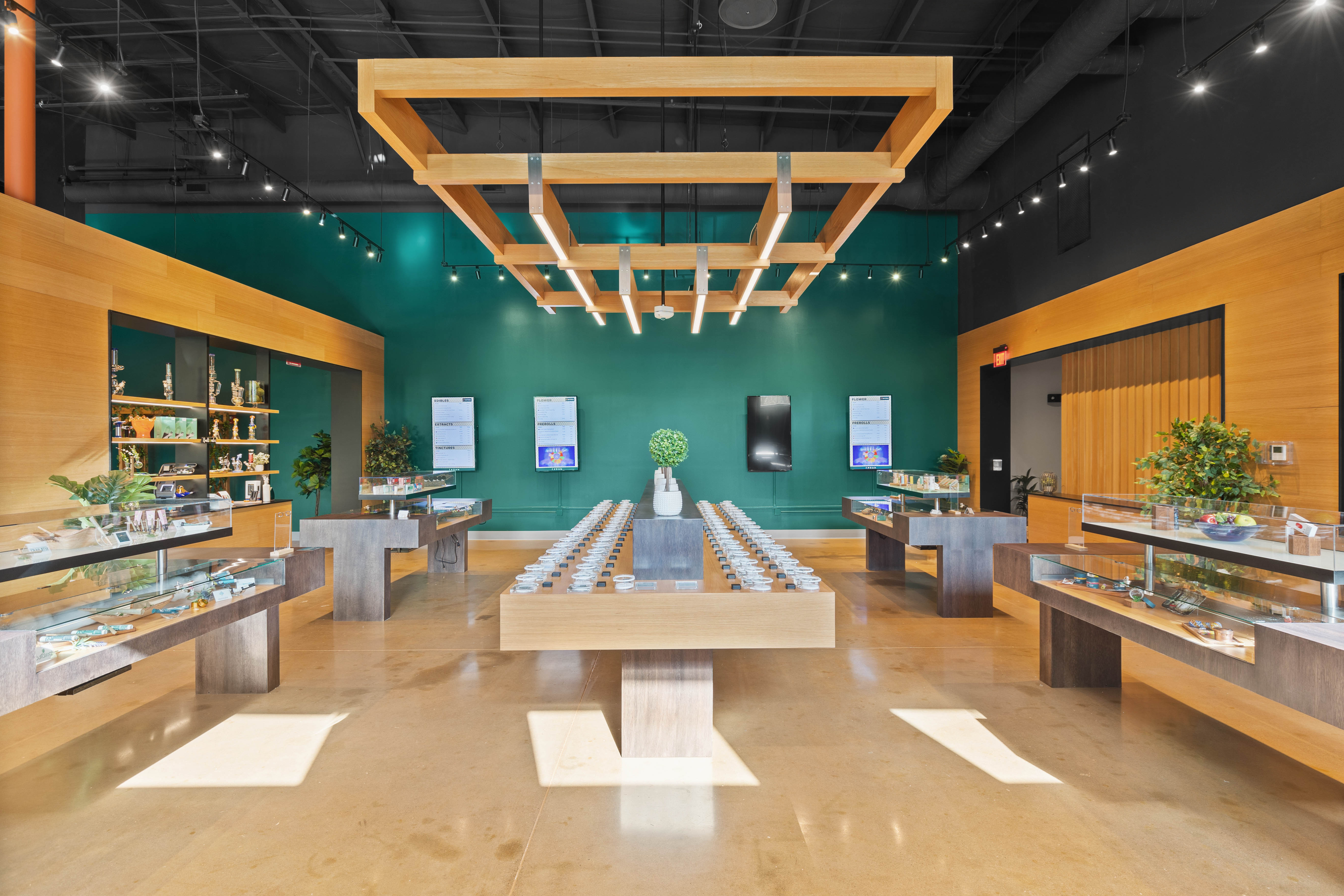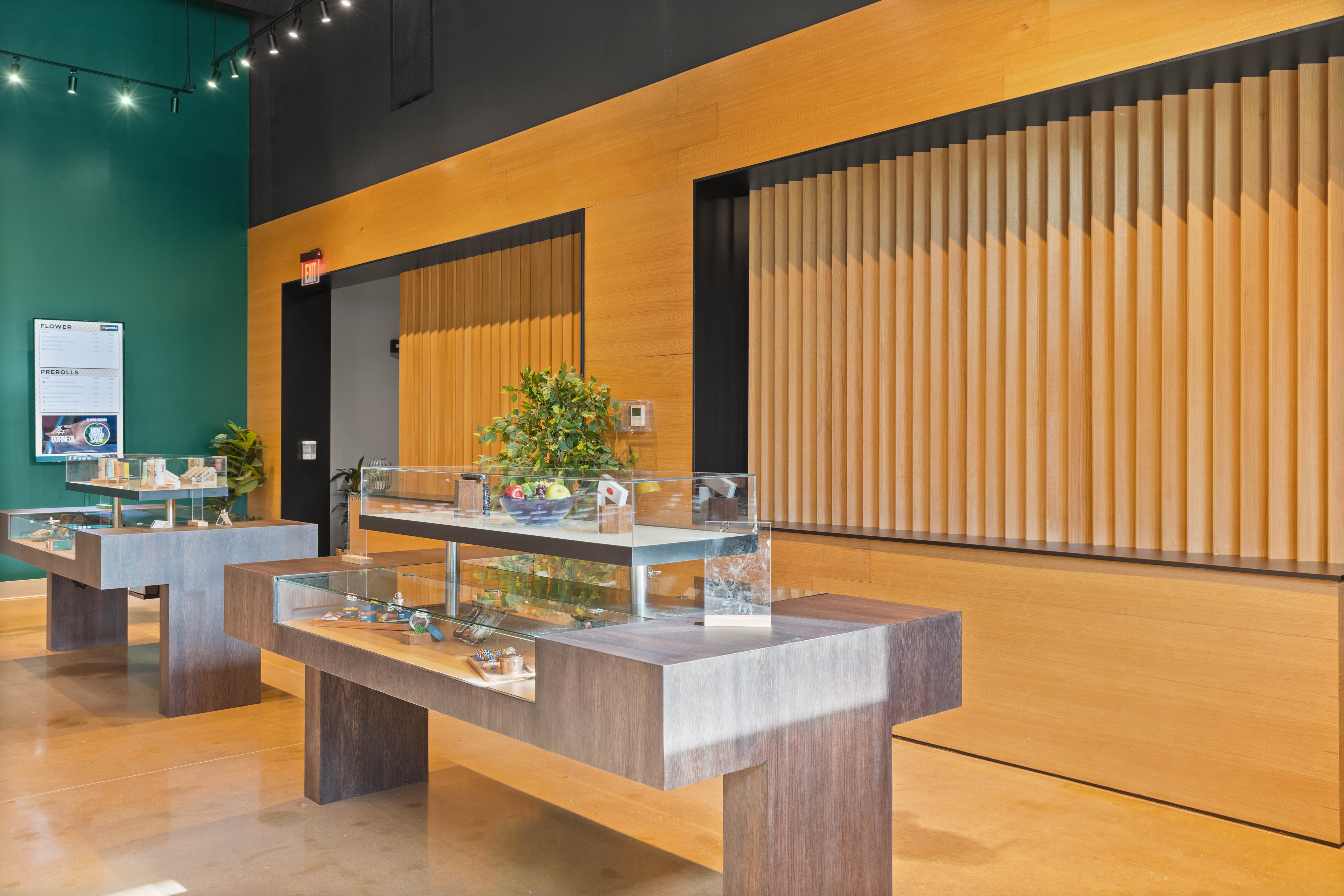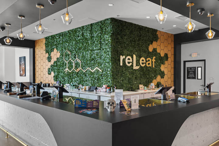 Structural elements were designed to emphasize both style and functionality. Clients enter the main dispensary floor from the reception area by way of an inset, hidden door. The dispensary features customized millwork throughout, including an intricate, wood-and-green honeycomb wall, while custom-made display tables showcase reLeaf’s organic products.