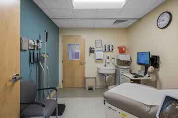 The project included a large amount of plumbing, HVAC and electrical modifications. The space features a sterilizing and washing station, which required new dedicated drainage and water feeds. Vantage installed two new rooftop HVAC units and ductwork throughout. The team reinforced the roof structure to support the 40- and 50-ton rooftop units, which were installed by crane. Vantage installed hospital grade electrical cabling and back-up service to ensure no loss of electrical service, to support, for example, the refrigeration units storing vaccines and other medicines. There is VCT flooring and carpeting throughout, allowing for ease of moving wheeled computer carts from room to room as well as allowing for ease of access for patients.