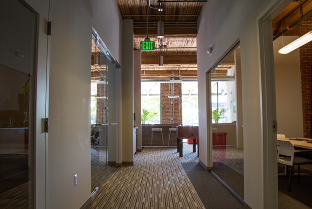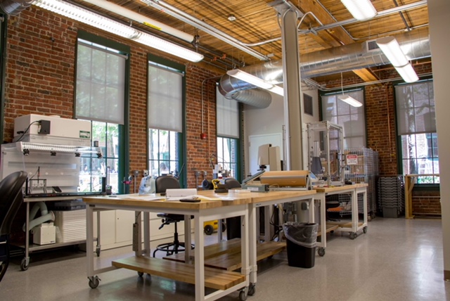 Efficient lighting installed throughout helps create a bright atmosphere. Carpeting was installed in the common areas and conference room, while VCT (vinyl composition tile) was placed in the workshops. Vantage renovated the kitchen area with new counters, millwork and paint.