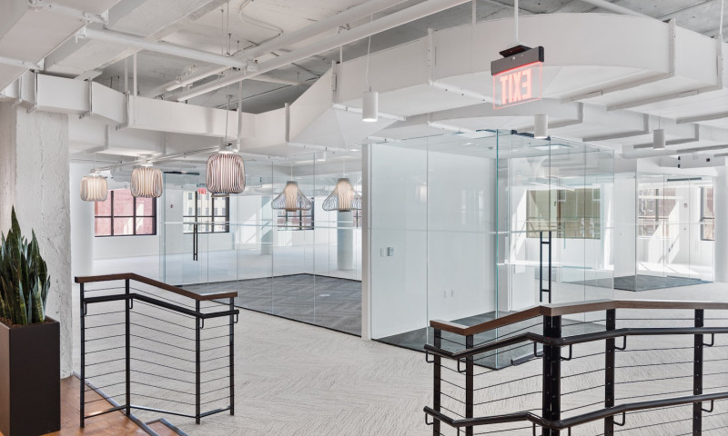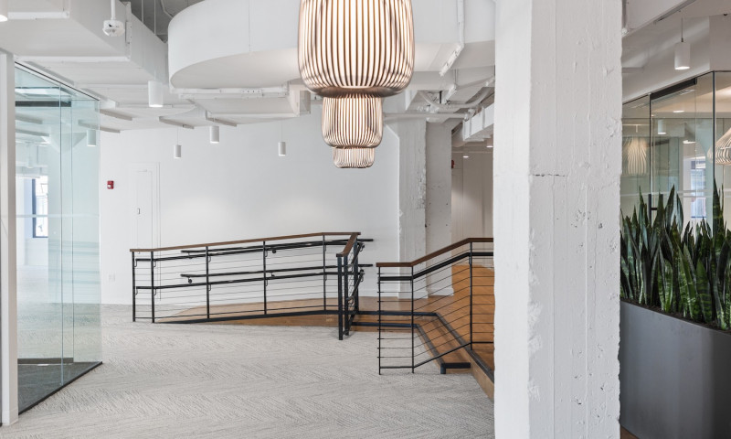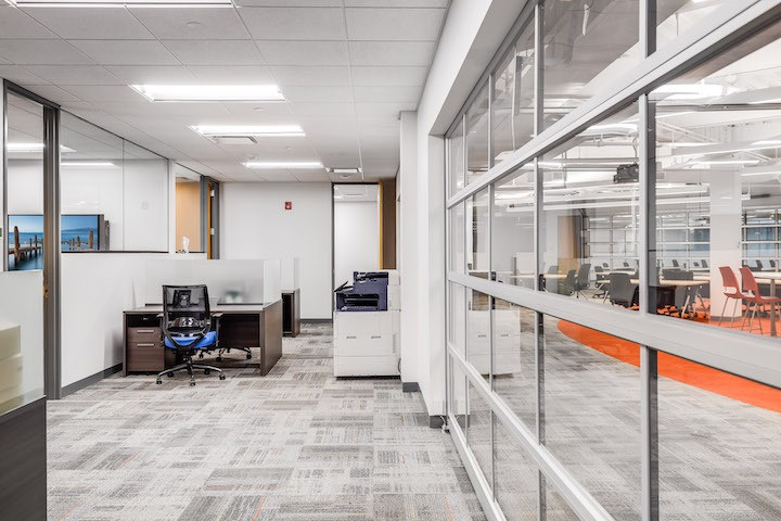 Soon after purchasing 40 Warren Street, DLJ Real Estate Capital Partners began a capital program to redevelop the 53,000-SF mixed-use building. As part of the plans, DLJ added a fourth floor to the original building and hired Vantage Builders to convert the second floor from parking to Class A office space. The Vantage team completely transformed the former parking level, creating a floor plan that features a large open office area and four glass-walled conference rooms, that support collaborative work teams of varying sizes. Redesigning office space that previously had been planned for parking created certain challenges. The Vantage and Visnick & Caulfield teams were in constant communication throughout the project, particularly to complete mechanical, electrical, plumbing and HVAC coordination that required real-time updates from the onsite superintendent. The office area has an interesting design aesthetic that will appeal to tenants, with exposed ductwork and building support columns, which feature intricate new capitals. The building offers expansive views of Boston via its plentiful windows and Vantage installed new lighting with timers to complement the abundant natural lighting that fills the new office area.
