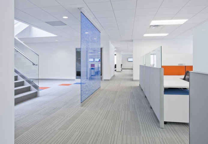 Vantage began by completely gutting the two floors, to create an open area to build on plans from project architects, the McGuinness Group. A striking glass staircase was built between the second and third floors, to enable collaboration among the growing team. The office features high-end millwork and attractive translucent partitions from 3form provide an intriguing design element while also boosting the interior’s natural light. The expanded space features 22 offices and room for 97 workstations, 4 conference rooms and a 16-person board room. A new presentation room that accommodates 60 people also serves as a lunch room, providing a nice place for employees to gather. A pre-action fire sprinkler system, which protects computer equipment from accidental activation, was installed in the server room. The server room was also outfitted with a separate cooling system.