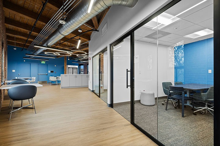 A historic mill and industrial building, 64 Pleasant Street has served in the paper, manufacturing, printing and laundry service industries during its 160 years. The project began with a precon agreement, with the Vantage team providing design-build services. Key to the project was designing a MEP layout that would highlight the beautiful, exposed post-and-beam original construction of the building, to give Culture Pop an eye-catching space. This required consolidating as much of the above-ceiling MEP as possible over the rooms that would have ceilings – the conference, huddle and phone rooms. The 5,000-square-foot layout is very open, allowing for communication and collaboration among the Culture Pop team. There is a new kitchenette and breakroom, a lounge area, and a welcoming reception area and all the rooms feature demountable glass fronts. With the new third floor location, the team removed several of the large external windows to allow for accepting materials directly into the space, in order to complete the project with minimal disruption to the building’s other tenant, Via Separations.