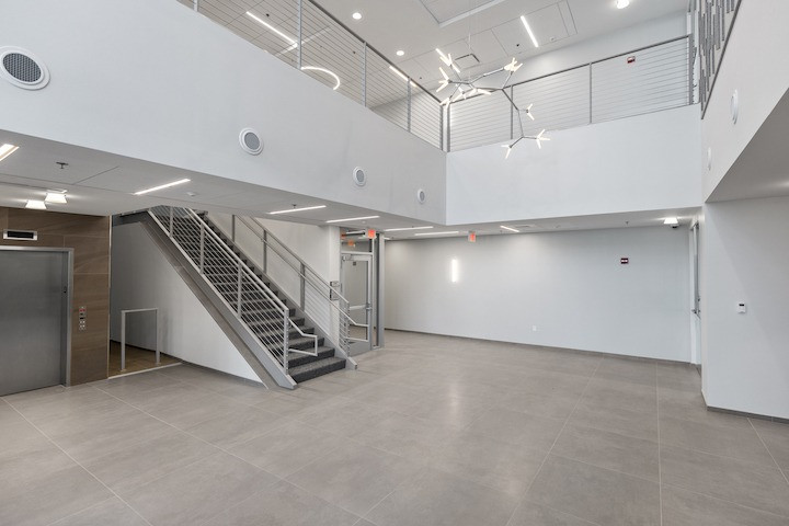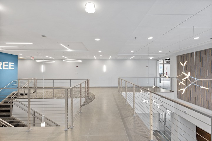 Vantage Builders recently finished a complete restack of 343 Winter Street in Waltham, on behalf of Hobbs Brook Real Estate, a subsidiary of FM Global. As part of its plans to lease the three-story office building, to either a solo occupier or multiple tenants, Hobbs Brook hired Vantage Builders to renovate, upgrade and transform the common areas and demo existing tenant areas to create “white box” space, ready for new occupants. As the project progressed, with the Vantage team successfully completing each aspect, Hobbs Brook expanded the scope to include additional work. The main entrance lobby on the second floor was opened up to create a new, multi-level lobby atrium, which required removing steel and decking sections of the third floor, as well as the installation of new custom cable railings.   The third floor roof balcony was retrofitted with new exterior perimeter railings, roof and insulation, meeting all code requirements, and both entrances were updated to meet ADA standards. The bathrooms throughout were completely renovated, elevator finishes were updated, and new, full-height double glass doors were installed at all tenant entrances off the common areas. The building features a new fire alarm system and new HVAC with a rooftop unit, hydronic piping loop system and boilers. Exterior work included an updated main entrance, new ADA standard ramps and automatic door openers, and a repaved parking lot with granite curbing. In early 2022, 343 Winter Street was awarded LEED Core and Shell Gold rating certification.