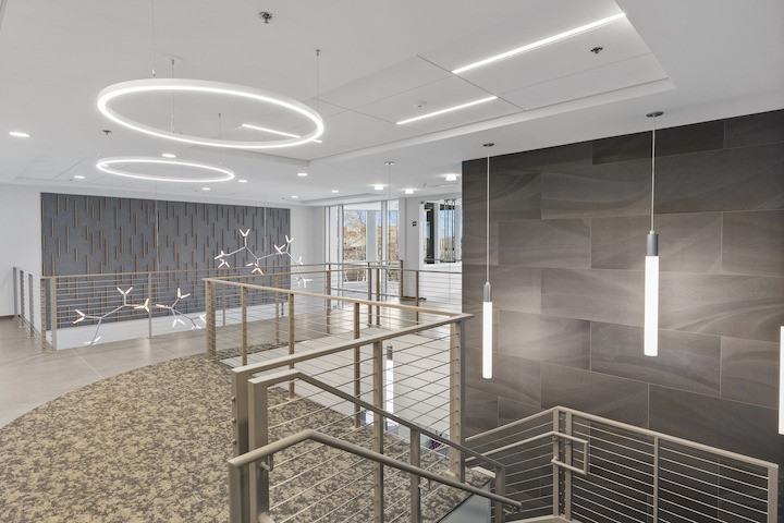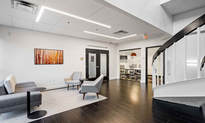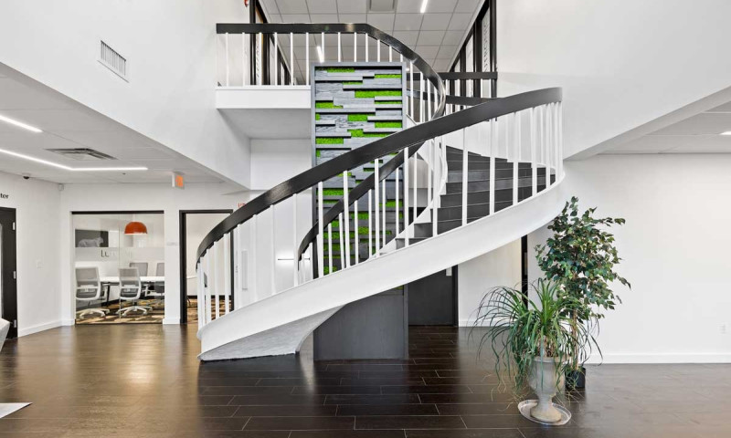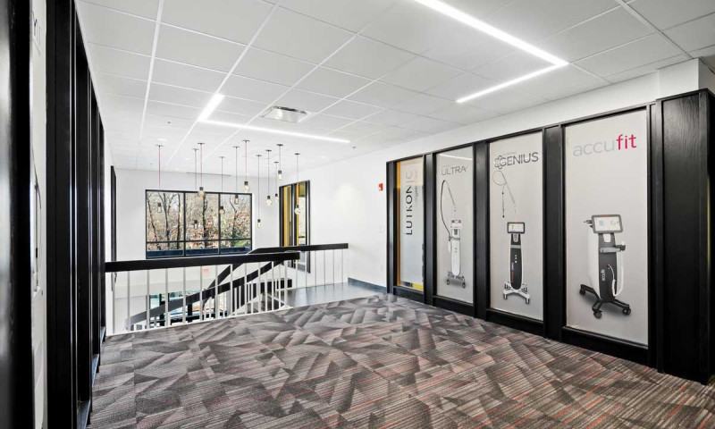 Lutronic, a global leader in laser and energy-based systems for medical aesthetics, hired Vantage Builders for a project at its U.S. headquarters in Billerica. The 20K SF renovation included work in the building’s lobby, clinical space on the first floor and office space on the second. An important factor in the project was that the Lutronic team needed to maintain occupancy. The Vantage team worked diligently to reduce construction noise and shutdowns to minimize disruption to Lutronic’s employees. A highlight of the project is the building’s new lobby, which features a rebuilt spiral staircase, an eye-catching moss wall, and new lighting. The Vantage team expanded Lutronic’s clinical space on the first floor, converting former warehouse space into three offices, a large conference room, a kitchenette and a sitting area for clinic visitors. The entire second floor was renovated, creating 15 new offices, a training room, conference room, a collaboration huddle room, and cubicles.