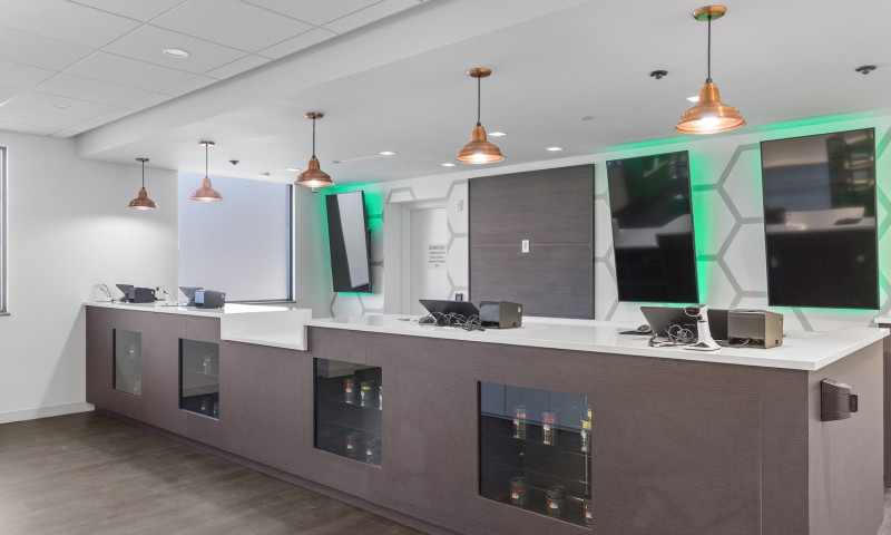 Atlantic Medicinal Partners’ new location features both a state-of-the-art cannabis cultivation facility and contemporary dispensary. Located in a former LEGO factory, the project pieced together both space renovation and ground-up construction. The project included a full restack of the building, consisting of all new ductwork, HVAC piping, and plumbing. There are new electrical and fire alarm systems, security that includes cameras and a card reader access control system, as well as fertigation and CO2 systems. AMP has six flowering rooms and a mother/vegetation room, grow tables and HPS grow lights. The facility also has an extraction room, dry and cure rooms, commercial kitchen, secure loading dock area and storage vault rooms with security mesh in the walls. The HVAC system is on a BMS that is fully dialed in with the grower to provide the optimal environmental conditions for the plants, while HEPA filters and UV lights in the units keep the grow rooms safe from mold and pests. A power service upgrade to 2300 amps was needed to support the MEP equipment and grow lights for the facility, which required the ground-up construction of a new mechanical building to house the gas-fired Tecogen chillers and the new main electrical switchgear. The dispensary has a sleek contemporary look with open exposed ceilings, L-shaped POS counter with 14 POS stations, display cases with designer pendant lighting, polished, black-stained concrete floors and new entry and exist vestibules.