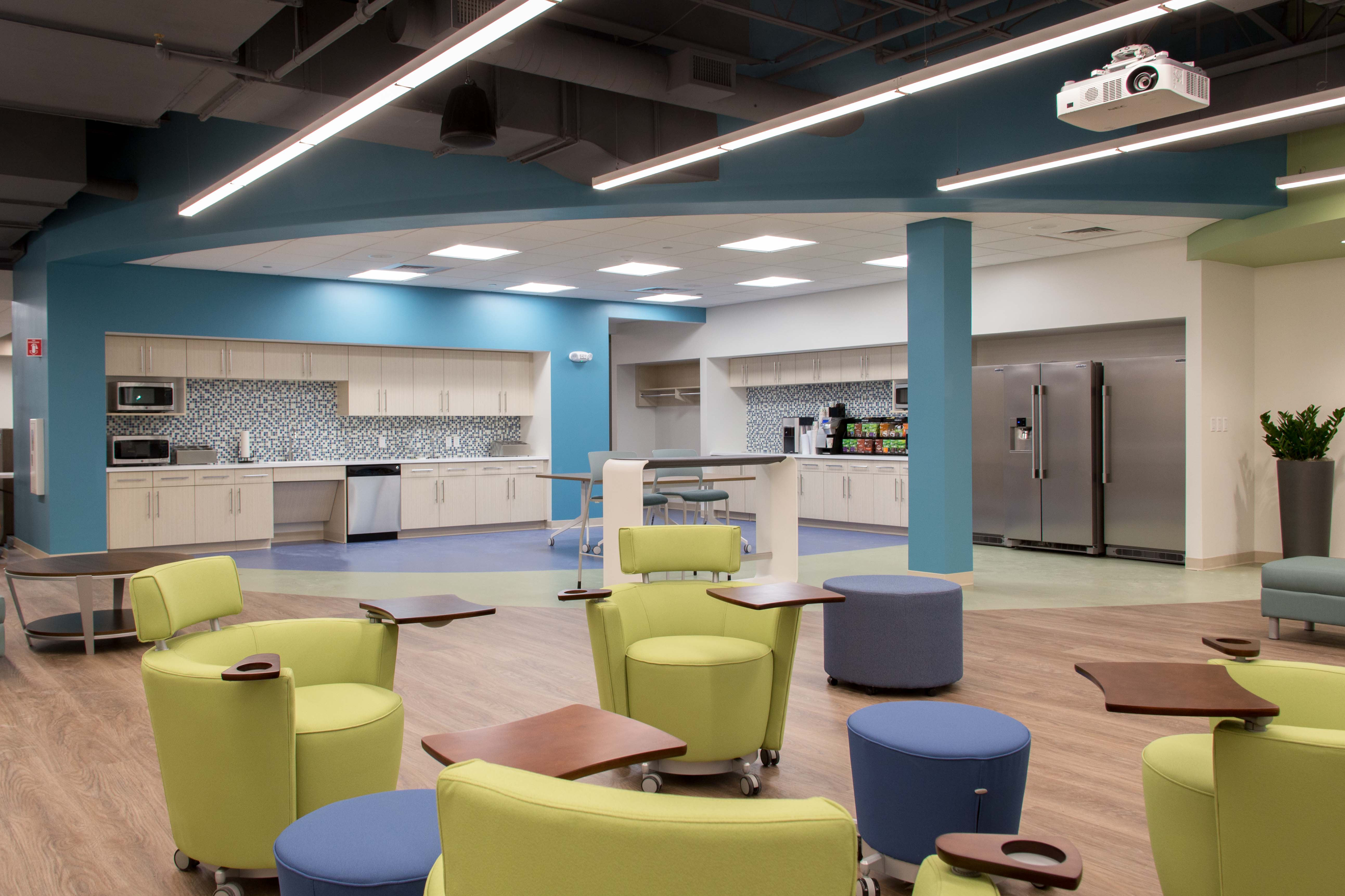 Vantage built a new employee break room and conference space, with a drop-down screen and overhead projector for group meetings. A new locker room area supports Vapotherm’s active employees. A display area shows off Vapotherm’s respiratory products and features working oxygen and compressed air systems.