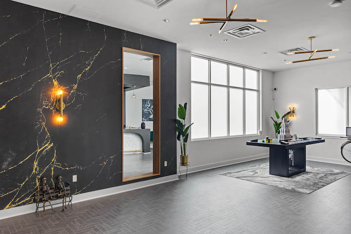 The project team removed a large, overhead garage door to create a new glass storefront and installed multiple large exterior windows in the former warehouse space, which allow ample natural light into the store. Clients are greeted in the reception area which features sleek wall-to-wall wood benches. The focal point of the sales floor is a large, custom-wood and lighting “cloud” suspended from the ceiling.