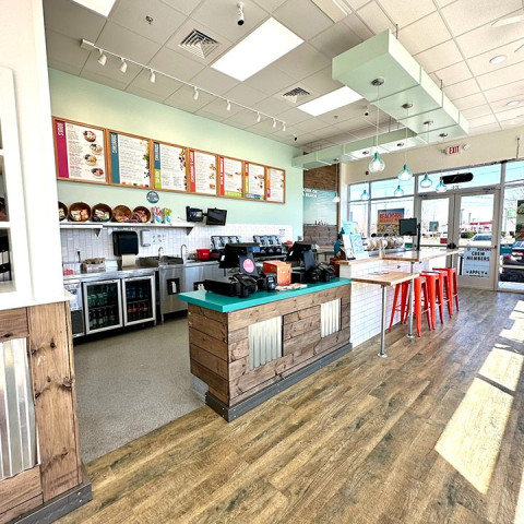 Vantage Builders was hired by Carpionato Group to do a build-out for a new retail tenant. The Vantage team completed a new Tropical Smoothie franchise location, working with Neptune Design Group and Tropical Smoothie’s design and construction team to create a welcoming, bright location for the restaurant chain’s dedicated customers. The project included significant systems work, including new electrical, HVAC, plumbing and a fire protection system. The restaurant features a kitchen area, point of sales counters, and a dining area with several tables as well as a hightop bar area with seating. Vantage installed a new, suspended ACT (acoustic ceiling tile) ceiling and new lighting. The kitchen area has epoxy flooring, while the customer area’s feature luxury vinyl tiling (LVT) floors. The two new bathrooms are ADA compliant.