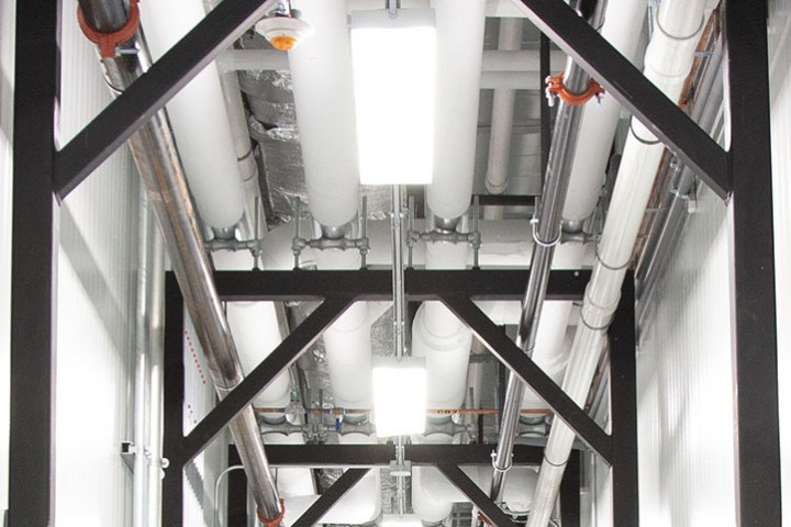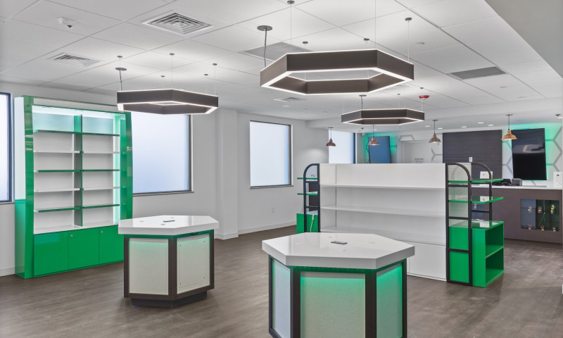 Atlantic Medicinal Partners’ new location features both a state-of-the-art cannabis cultivation facility and contemporary dispensary. Located in a former LEGO factory, the project pieced together both space renovation and ground-up construction. The project included a full restack of the building, consisting of all new ductwork, HVAC piping, and plumbing. There are new electrical and fire alarm systems, security that includes cameras and a card reader access control system, as well as fertigation and CO2 systems. AMP has six flowering rooms and a mother/vegetation room, grow tables and HPS grow lights. The facility also has an extraction room, dry and cure rooms, commercial kitchen, secure loading dock area and storage vault rooms with security mesh in the walls. The HVAC system is on a BMS that is fully dialed in with the grower to provide the optimal environmental conditions for the plants, while HEPA filters and UV lights in the units keep the grow rooms safe from mold and pests. A power service upgrade to 2300 amps was needed to support the MEP equipment and grow lights for the facility, which required the ground-up construction of a new mechanical building to house the gas-fired Tecogen chillers and the new main electrical switchgear. The dispensary has a sleek contemporary look with open exposed ceilings, L-shaped POS counter with 14 POS stations, display cases with designer pendant lighting, polished, black-stained concrete floors and new entry and exist vestibules.